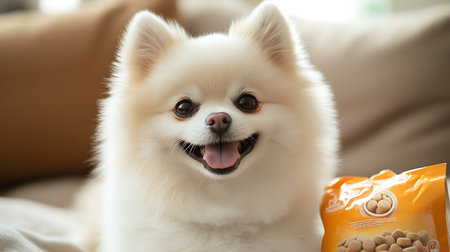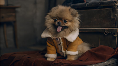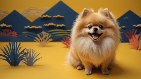 AI Generated. Happy Pomeranian dog sitting on a yellow background