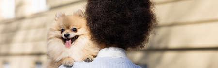 funny and joyful pomeranian spitz sticking out tongue and looking at camera in dog hotel, banner