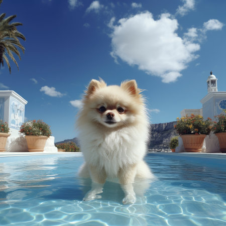 Pomeranian dog in swimming pool with blue sky and white clouds