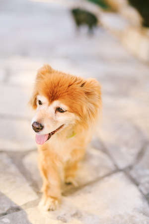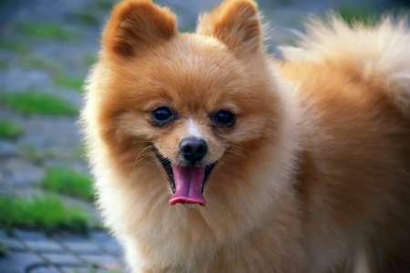 Adorable Pomeranian dog in orange colors sitting outdoors