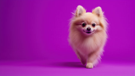 A fluffy Pomeranian dog is captured mid-walk on a vibrant purple background. The small dog