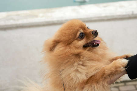 A small playful Pomeranian dog has put its paws on the owner's hand and looks at her with devotion. Copy space.