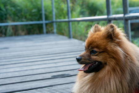 A pomeranian dog is sitting on a wooden bridge with its tongue out. The dog appears to be happy and relaxed