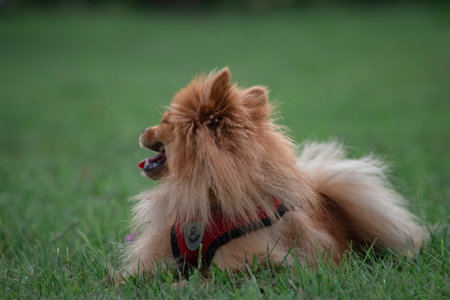 Beautiful Pomeranian Spitz dog sitting on the grass.