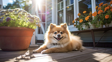 A cute and fluffy Pomeranian dog, proudly wearing a shiny crown, lies comfortably on beautiful wooden decking, fully enjoying the warm and sunny outdoor environment