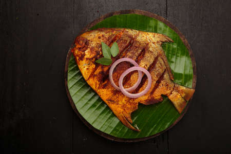 Closeup view of black pomfret fish decorated with fruits and herbs on a wooden background,Selective focus.