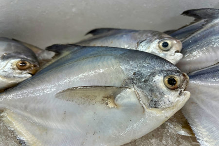 Fresh Silver Pomfret (Pampus sp.), Fresh fish for sale on a bed of ice at a seafood market