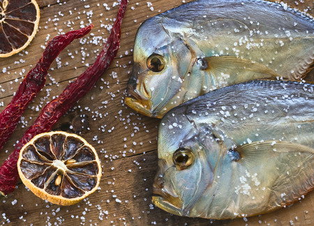 Two fish Cold smoked Vomero. Red pepper. Dried lemon. Are scattered sea salt. On a wooden background. Top view
