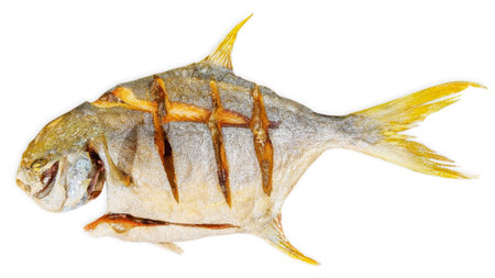 Top view of single grilled fried homemade fish with yellow fin and cuts isolated on white background prepared for healthy barbecue meal full of protein and omega 3 fat nutrients