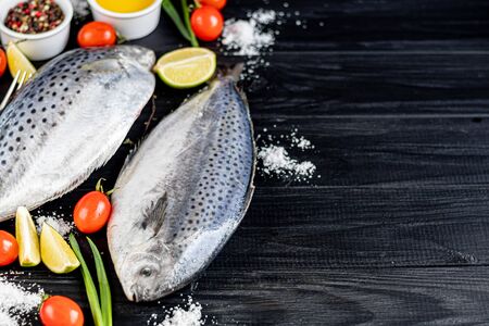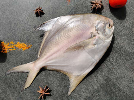 Top view of Silver Pomfret,White Pomfret fish dish cooking with various ingredients. Fresh raw fish decorated on a black background.Selective focus.