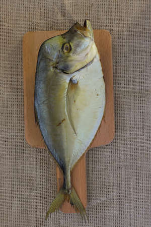 cold-smoked vomer lies on a wooden board, sea fish, background image