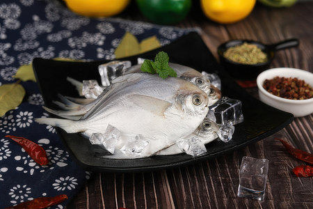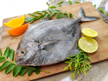 Raw White Pomfrot, arranged in a mecaranga peltata leaves with wooden background. and cooking ingrediants placed besides it .