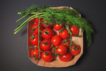 red cherry tomatoes with dill on a black background in a cardboard box. Vegetarianism. Healthy food. Vegetables.