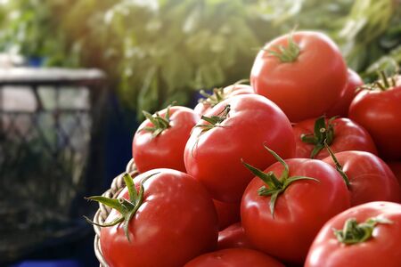 Close up raw fresh tomato put on small basket for sell in the market, fresh fruit and vegetable