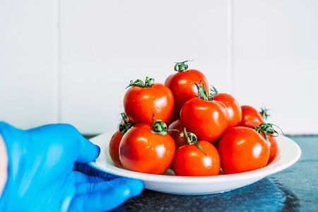 Hand holding a plate with tomatoes with blue latex gloves in the kitchen marble. Disinfecting the fruit to prevent the spread of the coronavirus.