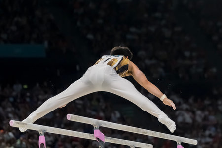 Jul 31, 2024-Paris, FRA; Paul Juda (USA) of the United States, competes in the Men's All-Around Finals at the Stade de France Stadium during the 2024 Paris Summer Olympics in Paris, France.