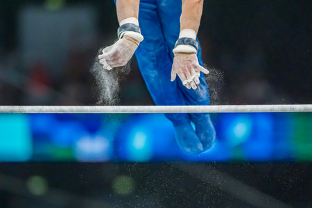 Young man gymnasts competing on the bar at the championship