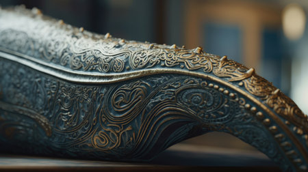 This close-up image captures a metallic surface displaying intricate textures and reflections under soft lighting, highlighting artistry and craftsmanship.