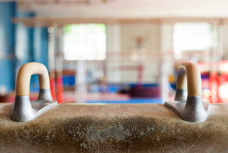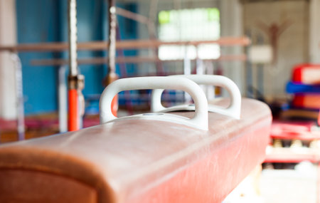 Closeup of gymnastics horse in gym for fitness, exercise equipment and training with grip. Background, handle and sports beam for strength, balance and workout in gymnast studio, club and performance