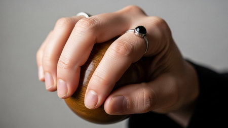 Close up of a woman's hand holding a wooden ball with a ring