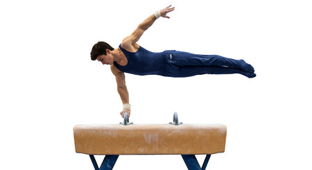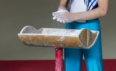 Close up of mans hands on the pummel horse.