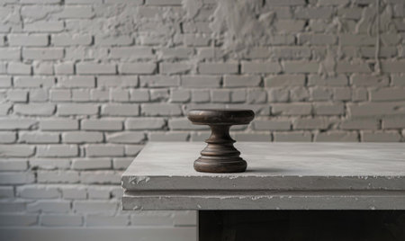 An industrial metal pedestal on a concrete table against a subtle gray brick wall backdrop