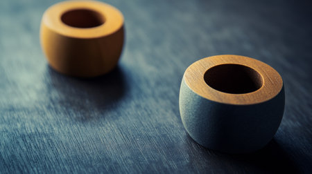 A clean and minimalist composition featuring wooden rings on a textured blue surface, highlighting simplicity.