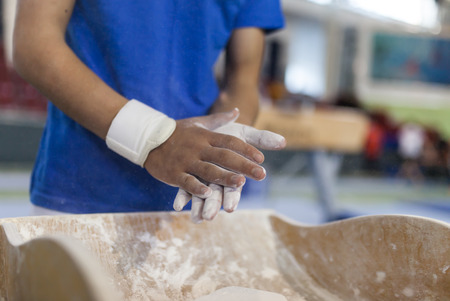 Close up of hand of a young caucasian man doing gymnastics in a gym