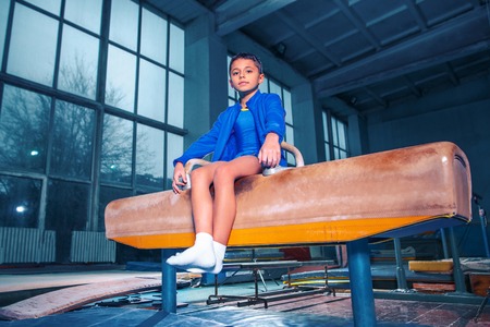 Little male gymnast training in gym, flexible and active.