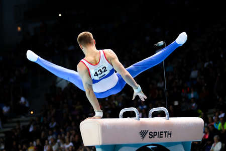 Szczecin, Poland, April 13, 2019: Russian athlete Vladislav Poliashov competes on the pommel horse during the European artistic gymnastics championships at the Netto Arena