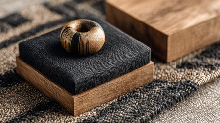 This captivating image features an elegant wooden box complemented by a textured textile base and a decorative round object, showcasing modern design elegance.