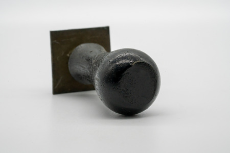 Highly detailed, shallow depth of field photograph focusing on the end of an old, possibly handheld metal seal or stamp tool, which shows signs of age and wear, resting diagonally across a rough, textured wooden surface illuminated by soft, directional light creating deep shadows.
