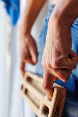 strong male rock climber's hand holds board for finger strength training with one finger. climbing workout at home. rock climber's hand close-up. fingerboard and hangboard