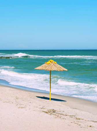single straw umbrella on the beach near the sea