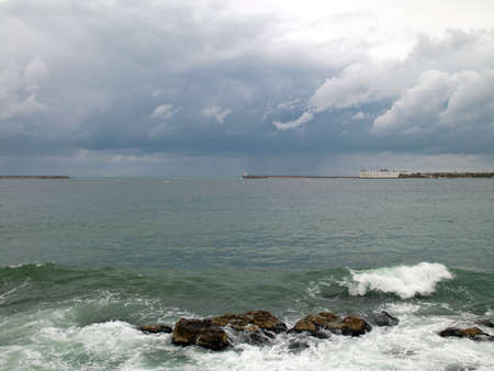Splashing waves and cloudy sky on a pebble beach in Batumi. Autonomous Republic of Adjara, Georgia.