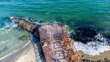 Aerial Drone View Flight Over Old Breakwater on Sandy Beach. Top View Waves