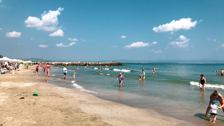POMORIE, BULGARIA - AUGUST 26, 2017: View of the public beach on the the seaside town of Pomorie on the Black Sea Bulgarian Black Sea Coast.