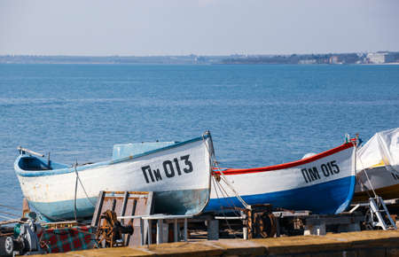 Many small old white boats and boats on a stone and concrete wide pier near the calm blue calm Black Sea, against the backdrop of a bright warm sunny sunset and a cloudy gray sky