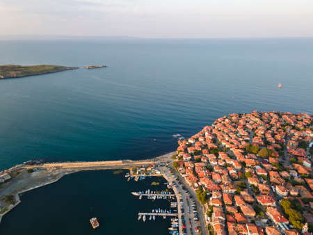 Aerial sunset view of old town and port of Sozopol, Burgas Region, Bulgaria