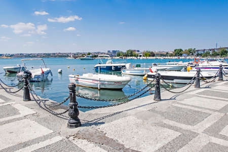 Nessebar, Bulgaria - 6 Sep 2018: Fishing boats at the Harbor Port of Nessebar, one of the major seaside resorts on the Bulgarian Black Sea Coast. Nesebar or Nesebr is a UNESCO World Heritage Site.