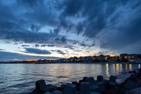 Pomorie, Bulgaria sunset beachfront sea view with promenade houses in the town and seaside resort on Black sea