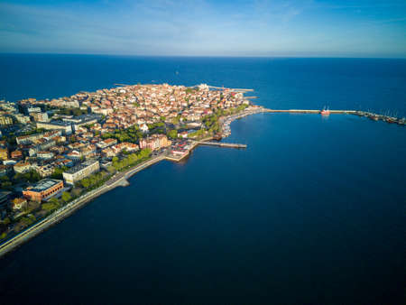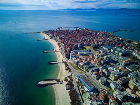 Panoramic bird's eye view over small ancient resort town of Pomorie with old European small houses and quiet calm empty streets, washed by the sea spring turquoise Black Sea on clear day in Bulgaria