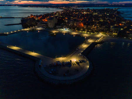 Panorama of the city of Pomorie with hotels and lights washed by the Black Sea under the starry sky in Bulgaria