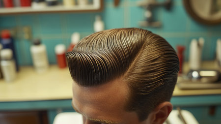 This image captures a close-up view of a meticulously styled classic men's haircut featuring a slick back with impressive shine, set in a charming barber shop.