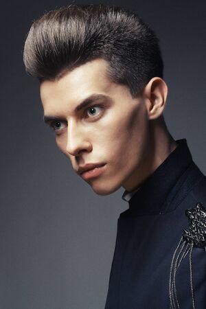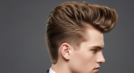 Young caucasian male with stylish pompadour hairstyle in profile view