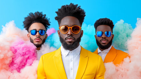 Three men stand confidently, each wearing unique sunglasses and bright suits. The background features vibrant, swirling colored smoke that enhances the trendy atmosphere. Generated AI. This is a fictional character not a real person