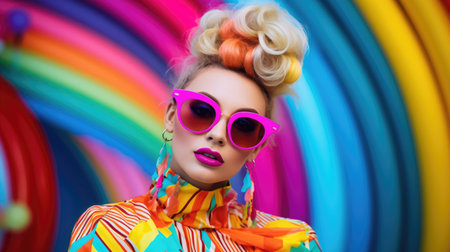 Smiling happy young woman in cool colorful neon outfit. Extravagant style, fashion concept background
