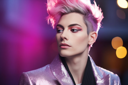 Beautiful transgender man with bright perfect makeup and pink hair wears shiny suit
