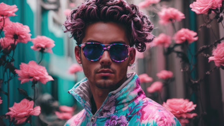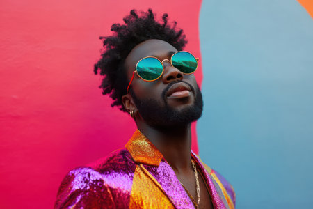 A man poses confidently with sunglasses on, showcasing a fashionable outfit against a backdrop of vivid colors and artistic lighting. The setting reflects a contemporary and creative atmosphere