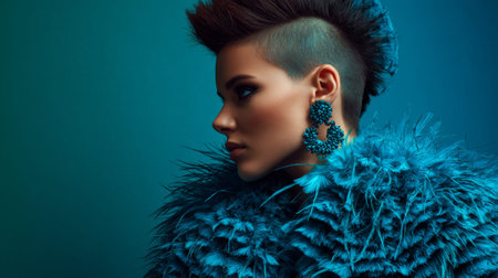 A fashion model displays an avant-garde style with a mohawk hairstyle and a blue feather coat. The background is monochrome, highlighting the bold look and accessories worn by the model.